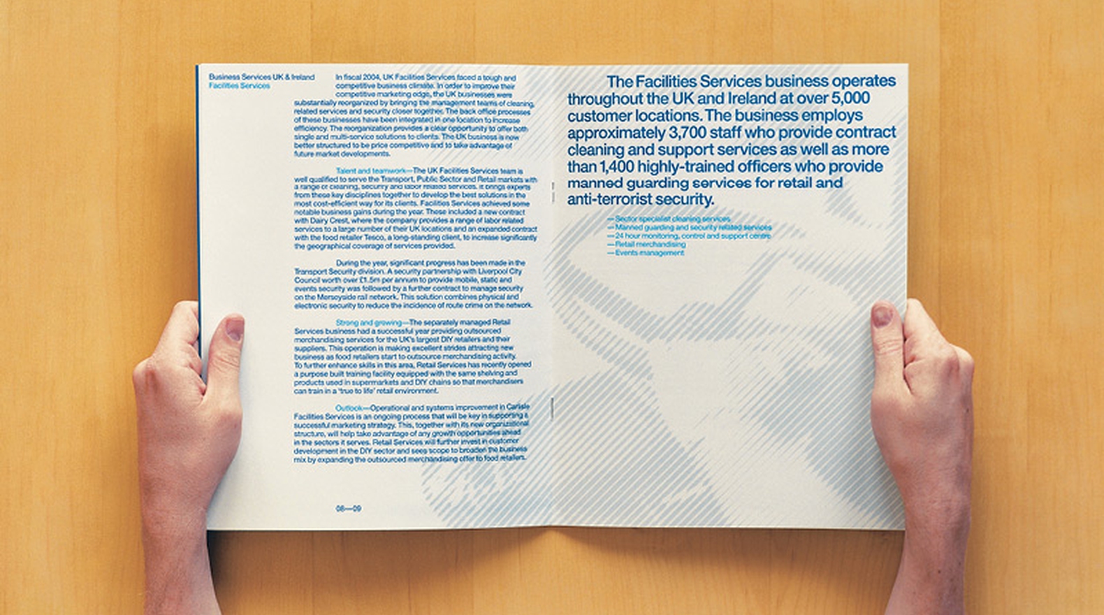 Simple and economically produced typographic annual reports for a business facilities service company.