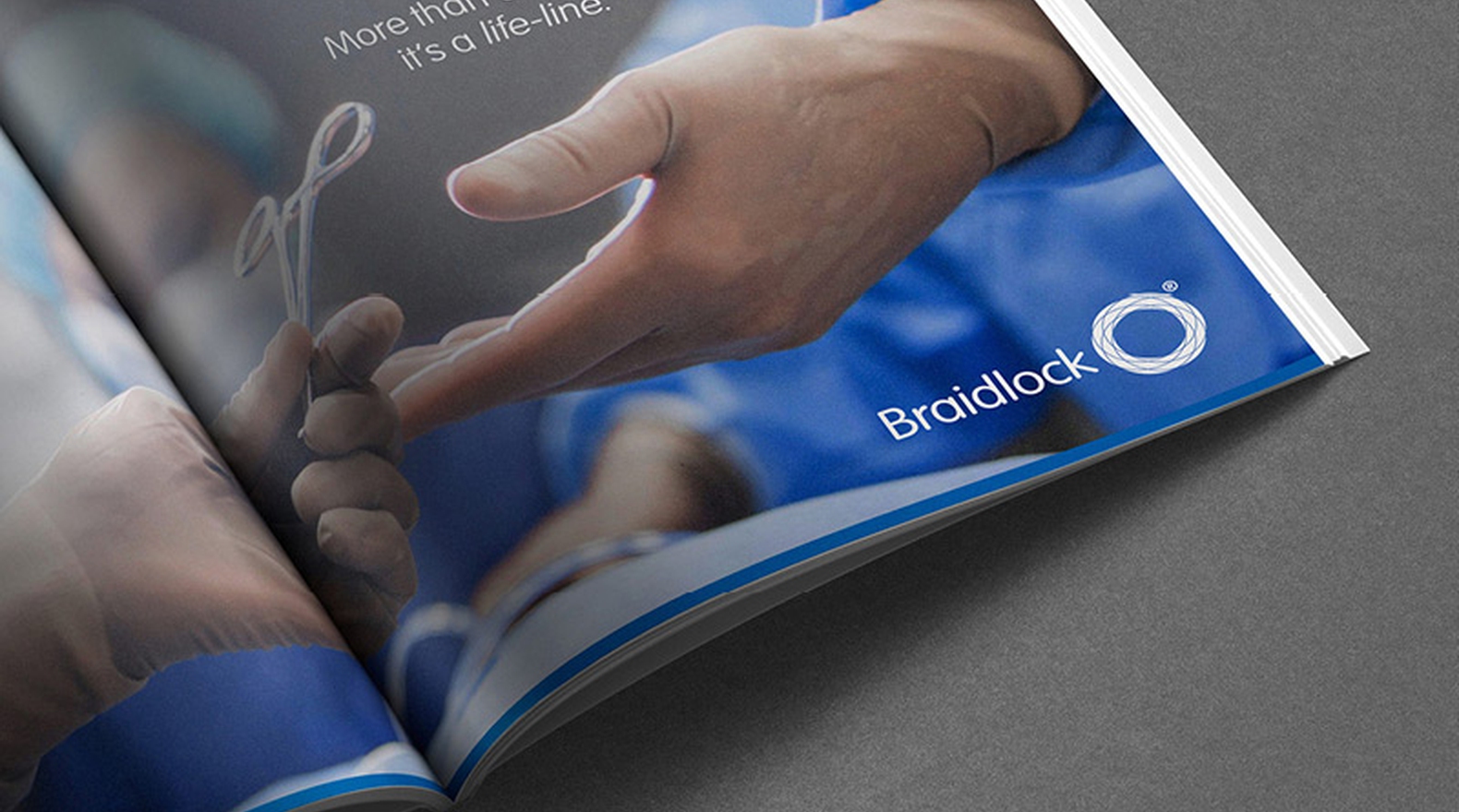 An identity system for a pioneering medical device developed by a Great Ormond Street pediatrician that allows safe and easy securement of an intravenous drip. The symbol articulates the physical attributes of the product; the expanding and contracting mechanism of the braided tube that the device is constructed from.